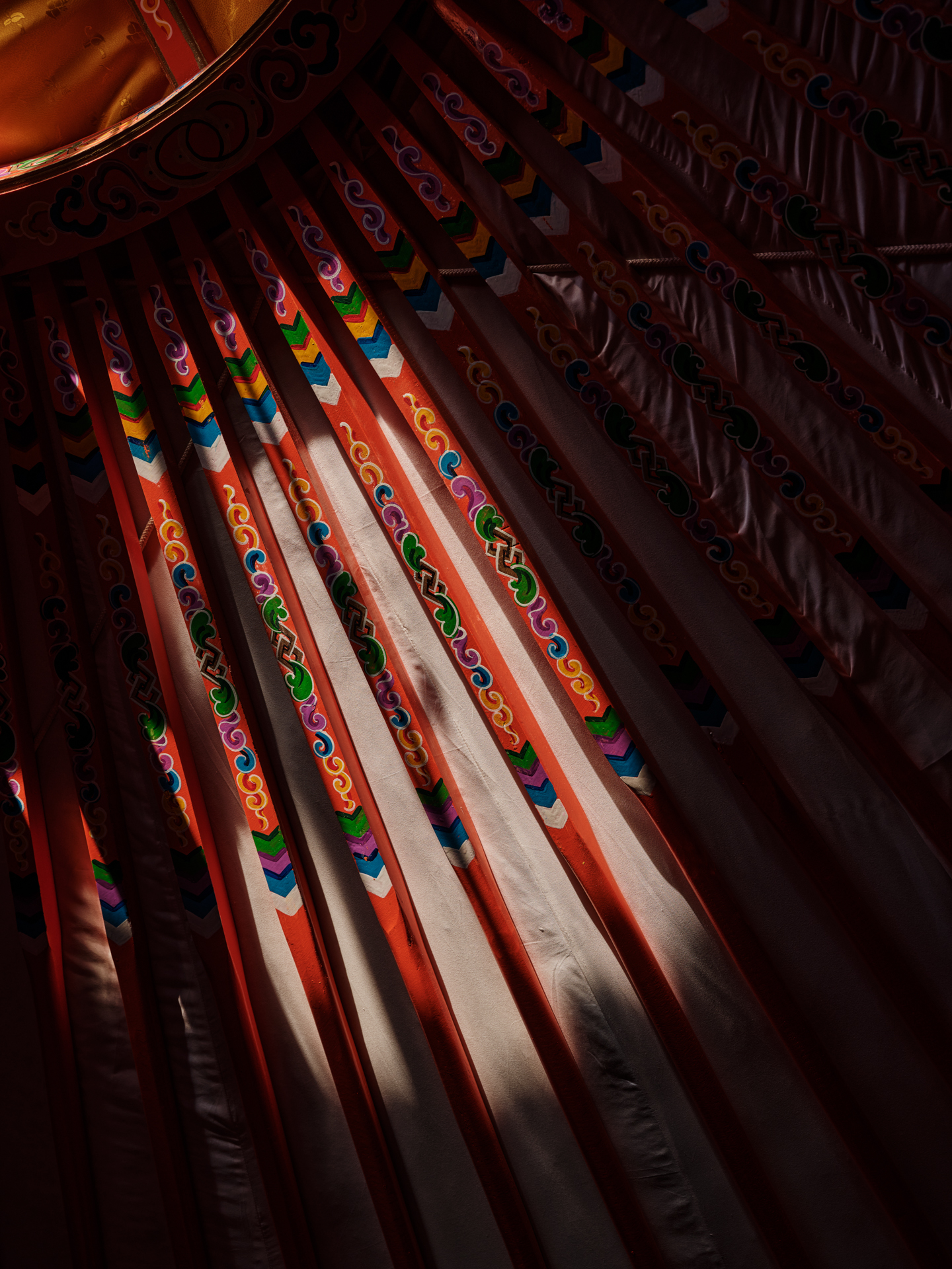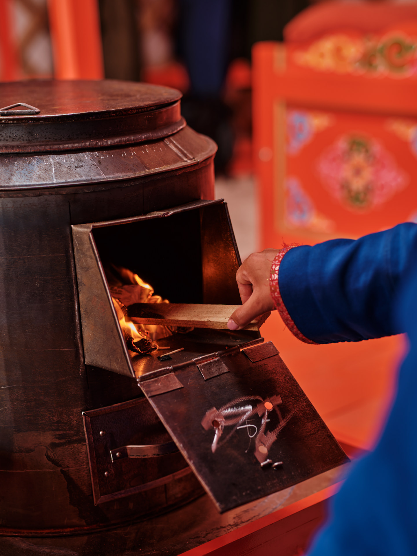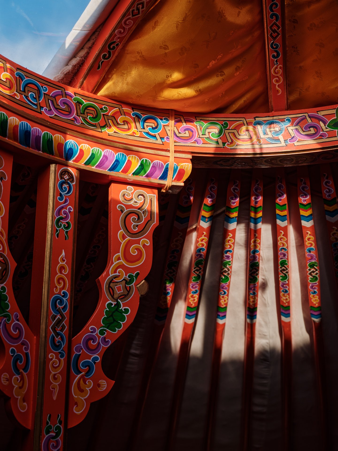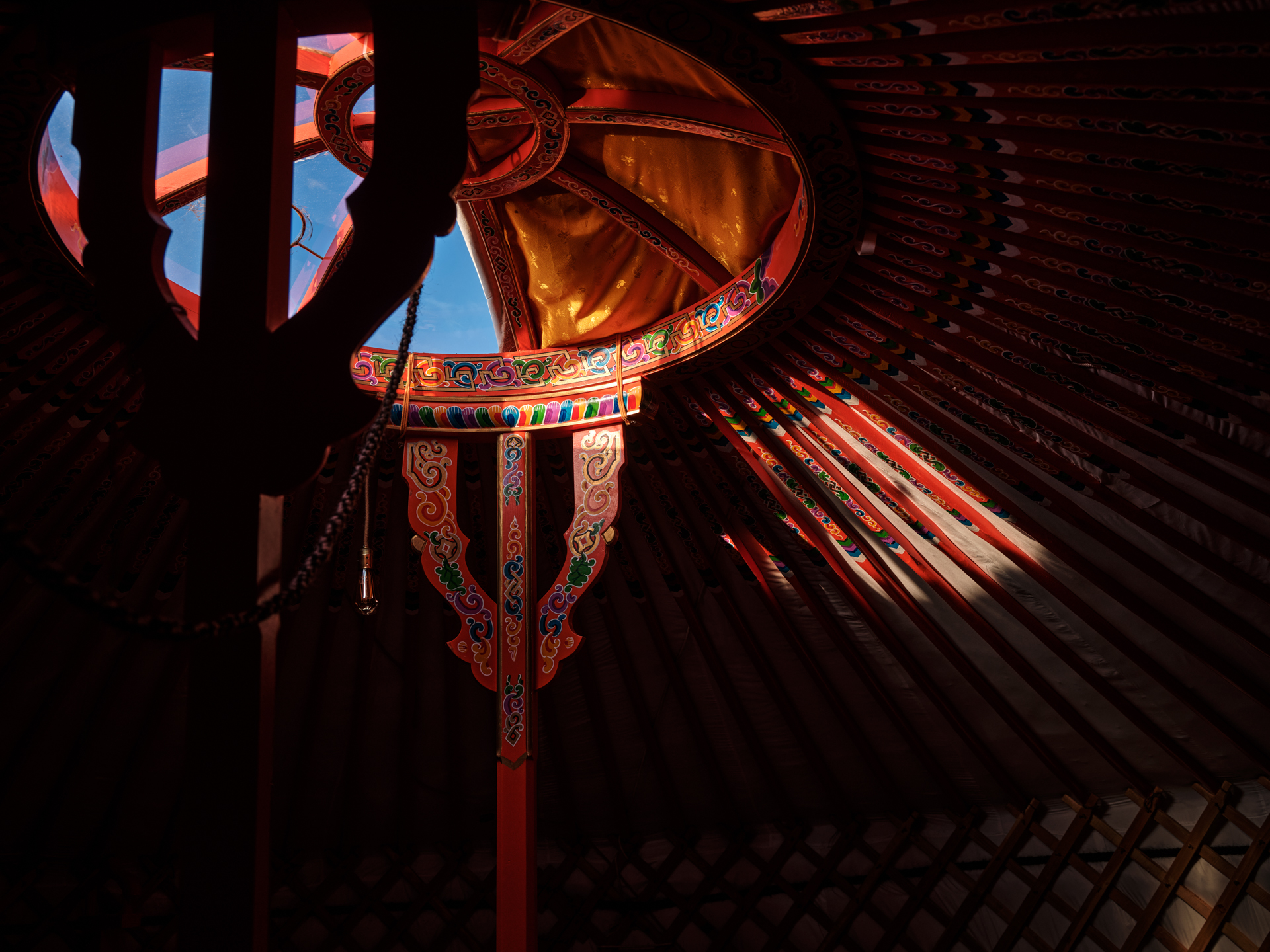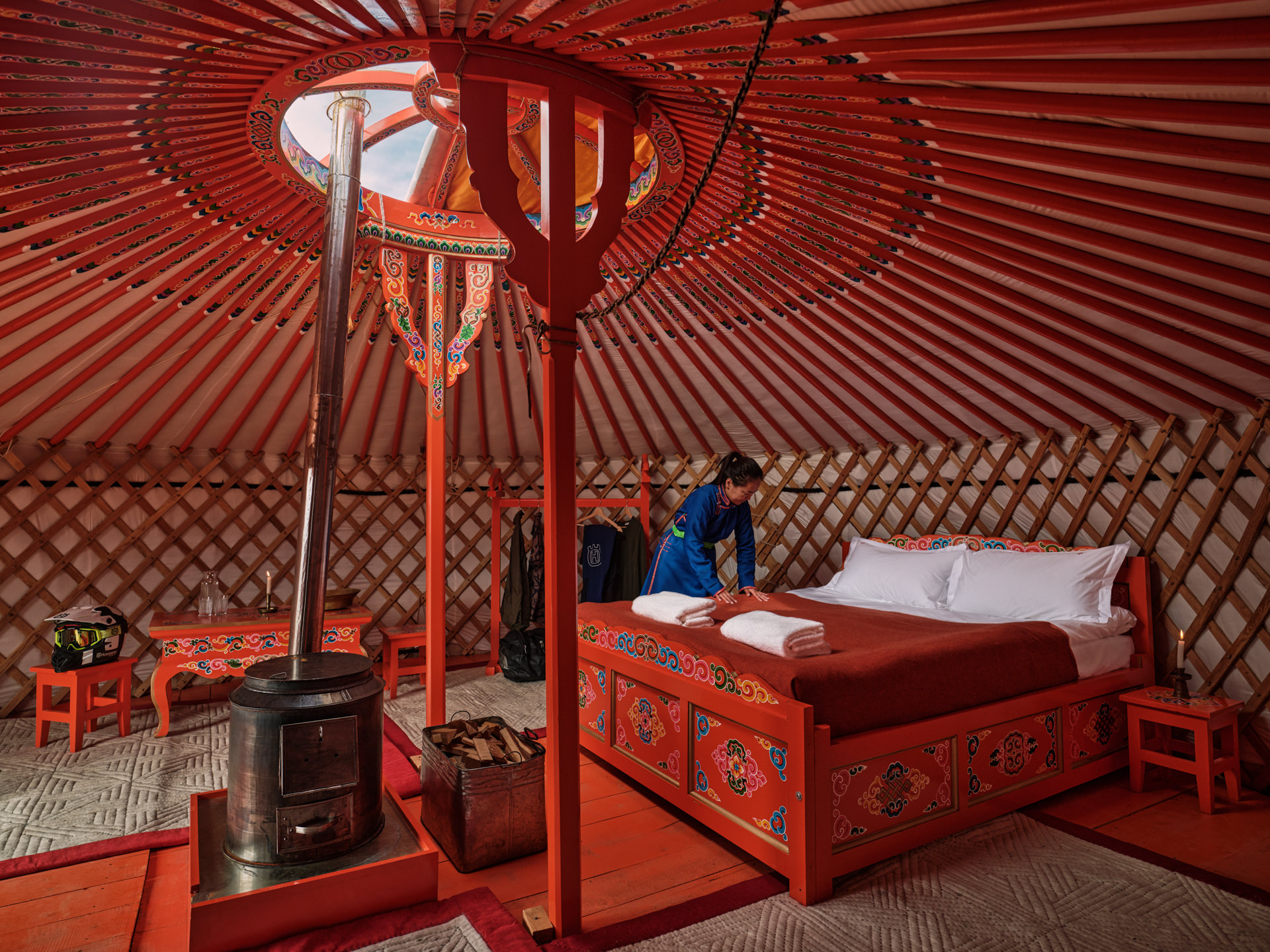 Your base for the retreat is a private ger set up at the edge of the dunes — traditional in shape and material, but finished to a standard that has nothing to do with roughing it. Inside: a proper western bed with a real mattress and soft linen, warm rugs underfoot, hand-painted wooden furniture in the classic Mongolian style, and a cast-iron stove that keeps the space genuinely cosy once the desert night cools down. The felt walls, the painted orange beams, the circular roof opening to a disc of stars — it is one of the most distinctive rooms you will ever sleep in, and it happens to be sitting fifty metres from a sand dune. This is not camping with extra steps. It is a considered, comfortable space that respects the tradition it draws from while making sure you actually sleep well. Beds are made up daily. There is space to unpack properly and leave things out. You come back to it after a long walk or a camel ride and it feels, within a day or two, like somewhere you belong.